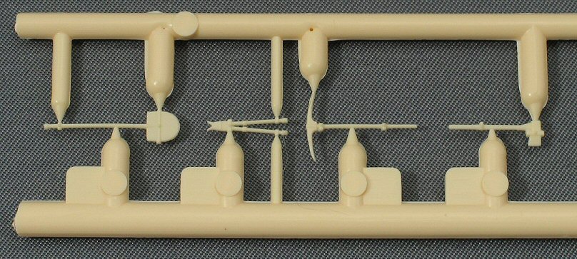 The small styrene sprue with tools is part of a bigger tool set, designed and produced by MACO (Set 72101). Being nicely moulded with sharp detail, this is a nice touch to include them. However, stowing away these (large) tools on such a small vehicle isn't straightforward. The instructions tell you to glue the pick axe on top of the fighting compartment, which seems a bit bizarre to me... | |||
