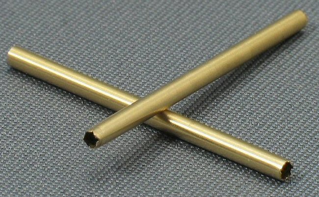The gun barrels are two lengths of hollow brass tubes, ideal to represent a smoothbore gun. But take care, one end has been cut off nicely, the other end (which will have to be glued inside the gun mask) has a chewed off appearance (which you can see on the image). You'll