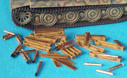 Included in the set are 10 full shells, plus 10 empty shell casings. Ten boxes with open lids are provided, each box capable of holding one shell. The woodgrain detail on the boxes is very nice. Somewhat more of a problem is the fact that the four vehicles mentioned in the name of the set didn't all use the same gun, and these guns didn't use the same type of ammunition. The shell casings in this set were measured (with a tolerance of about 0.2mm) and scale out to 648mm, which makes them closer to the KwK36 rounds (570mm) than to the KwK43 rounds (822mm). The shells also seem to have a little variation in length. I am not sure if this is an attempt to provide different types of shells, or if it was a problem with the molding. Overall, this is a very nice set, but I think that better detail on the shells is possible with the turned metal alternatives on the market. But then again, those are much more expensive as well. With a decent paint job, these will look fantastic. Thank you very much to Goffy Model for the providing the review item. |