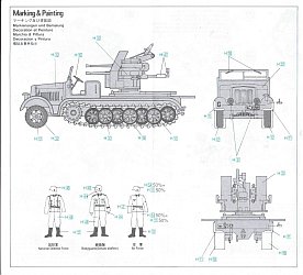 First, like all the Hasegawa minibox series, this kit contains sprues of light, very hard plastic, with its advantages and disadvantages. On the plus side, the hard plastic is very easy to cut from the sprue and does not break easily. On the minus side, for some modellers, it may be catastrophic trying to clean the parts with a small knife. Personally, I nicked my fingers many times before the parts were free from flash and seams. Building the model is straight forward. Instructions are very accurate. The kit has a detailed chassis, which is great plus for all Hasegawa models. It's detailed but on a sane level with no tiny, easy to break parts - all solid like a rock. Parts have mini slots for a more accurate fit. You may not want to glue the wheels on until the painting stage because the Sd.Kfz. 7/1 has rubber-covered wheels (which means the rubber must be painted black or "rubber" color in contrast to the main model color of gray or sand). The instructions direct the modeller to not glue the front window frame so it can move (upward and downward). The dashboard is less detailed. There is a steering wheel and an engraved plastic dashboard and some parts that I think represent the gear shift levers. The body of the Sd.Kfz 7/1 may be built in two ways: ready for action with the sides folded down, or in transport mode, with the sides folded up. The gun can be built so it can rotate 360 degrees. The gun is nice. It is very similar to the Italeri's version of the 20mm FlaK. The barrels need to be drilled to simulate reality. The kit also contains seven crew, one being the driver, and the remainder to man the gun. Their quality is satisfactory, though the legs and arms are crude with plastic seams on the heads. They need some work to make them better. The tracks are rubber. On the model they look bad, so replacements should be found if possible. Overview: This is a good model with many moveable parts though it is little hard to word with some of the smaller pieces. |