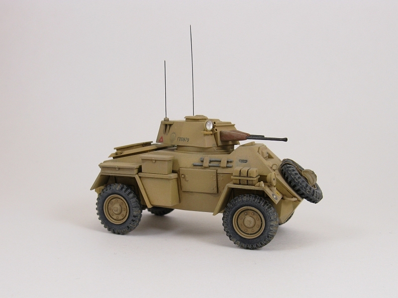 This Humber Mk.II is an old release of this vehicle by Hasegawa, probably molded in the 1970-1980 time frame. Inside the box you get a svelte count of 40 nicely molded parts in Hasegawa's excellent hard plastic. There are two short lengths of copper wire for the axles, a small decal sheet and an instruction sheet. Molded detail is very crisp. Flash was minimal, the only parts having any being the two tool boxes (parts 26 & 27). There were no sink marks of note except on back side of the wheels. Their position made them too difficlut to fill so they were left as is. You can't really see them once they're mounted on the axles anyway. The instructions are well laid out, easy to follow with no vagueness as to where parts are to be placed. One nice feature of the instructions is the naming of each part. I have always found naming the parts great because it also provided additional information about the vehicle and gave you a bit of an education along the way. The kit's two tarps are poorly molded with next to no detail or relief so they were assigned to the parts box and a replacement was fashioned from two part Tamiya epoxy with the addition of lead foil straps. I added lift rings to front and rear, handles to the engine cover and tow hooks to the front and rear. A scratch built shovel was attached to the left upper hull (an item that is sadly lacking and really should be included). The wheels are nicely detailed. Tire tread is very well done and as far as I can tell quite accurate. The search light was detailed with a chrome sequin for the reflector and 1-minute epoxy to represent the clear glass lens. I tried something new for the small lights on the fenders. These were drilled out, filled with gloss white paint and then filled with 1-minute epoxy to represent a clear lense. I think the end result shows enough promise to try this again on future builds. The main gun barrel and the smoke dischargers were drilled out. The cannon and machine gun can be glued in either of two positions: horizontal, or slightly elevated. The commander's hatch can also be molded shut, as I did, or cut in half to allow the figure to be inserted. Sections of guitar wire supplied the antennae. There is no suspension of any sort. Most of what I built was by guess and by golly because I couldn't find any clear photographs, only partial views of the Humber suspension. The few shots I did find show that the Humber definitely used a leaf spring suspension with a strut on the front. There are some exposed stearing components like tie rod ends and possibly an anti-sway bar on the front suspension but without a clear view of these I just settled for some springs attached to the axles along with the front strut. The leaf springs were liberated from a Hasegawa Jeep (got the Jeep for only a dollar at the local club's monthly raffle) and I added struts to the front from sections of plastic rod.