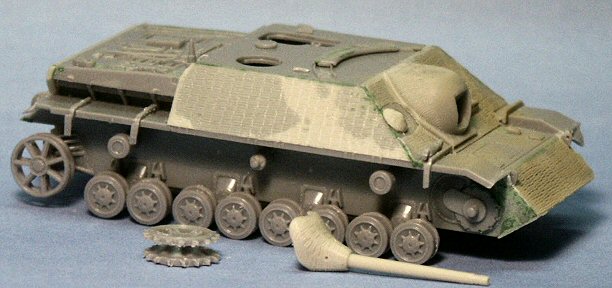 Kit Assembly Partially assembled the Hasegawa JgdPz IV showing the BP Resin zimmerit applied along with some Squadron green putty to fill in small gaps. BP Resin also includes a zimmerit coated cast gun mantlet and a resin gun barrel with a threaded end for a muzzle break (unused on this version of the JgdPz IV). Notice the bolt holes on the side of the mantlet; these are missing from the plastic kit's part so should be drilled. The return rollers used (part K3) are the rubber tired type and the idler wheel (parts ) the welded type as seen on the Pz IV Ausf. F and early Ausf. H tank. The