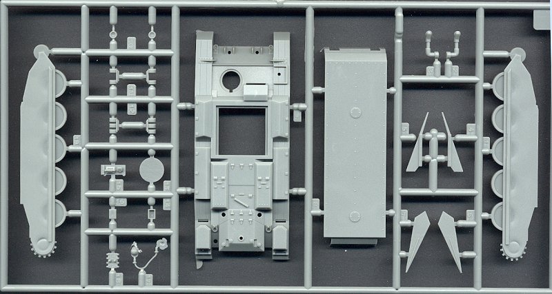 The quality of the moldings is very high, with superb surface detail, no flash, and very little in the way of sinkmarks. The driver's hatch, as well as the turret hatch, is molded open, a crewman is included, and the rivet detail is just crying for a decent weathering job. But there are also a couple of drawbacks to the kit: the inside sprocket is actually molded onto the hull, and the tracks, although fairly well detailed on the outer surfaces, are rather plain on the inside, and made from the horrible black vinyl for which Hasegawa is notorious. The molded-on pioneer tools is also old fashioned. A major feature missing from this model is the metal side skirts used in the desert. Although the Revell website at one time showed a built model with these skirts, they are in fact, not included.