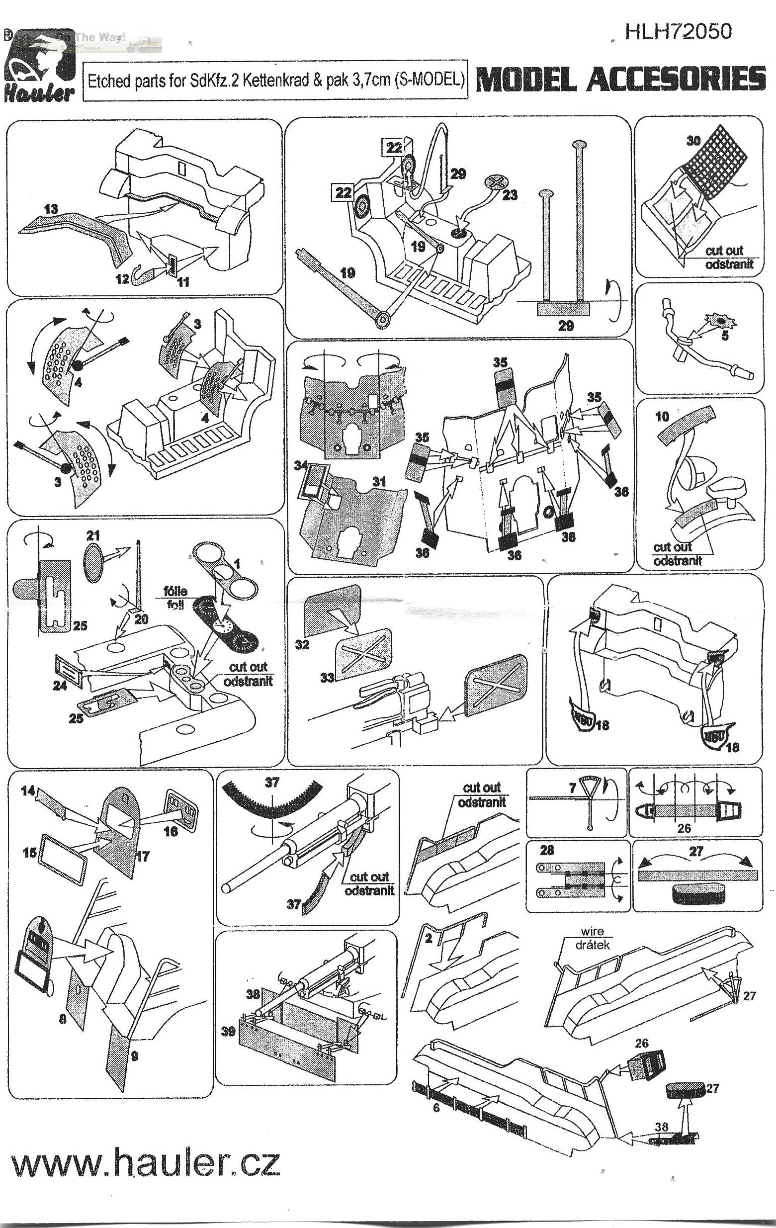 This PE set is meant for S-Model kit 720087 and as that kit contains two complete Kettenkräder and two Panzerabwehrkanonen, the set contain all hat is needed to cover them all. The set allows the modeler to improve almost all areas of the Kettenkrad, and even includes the small NSU plates (with readable inscription) to go on the front of the body. A small transparency is provided for the dashboard. The only thing that still seems necessary when upgrading the Kettenkrad is the front suspension as done on the third model here. Something that needs to be pointed out is that the PE handrails are completely open, which would not be correct for the S-Model kit, unless the modeler also increases the diameter of the holes in the roadwheels and turn the model into a proper M1 type (whereas the S-Model kit, out of the box, is an S1). For the Pak most of the parts will go into the shield and the protective plate to the side of the breech. In my opinion it would be nice if Hauler also released a set for S-Model 720080 (the stand-alone Kettenkrad) and 720088 (the Kettenkrad with the Püppchen), but for the time being, I'll be happy to try this set out on the set that it was designed for. |