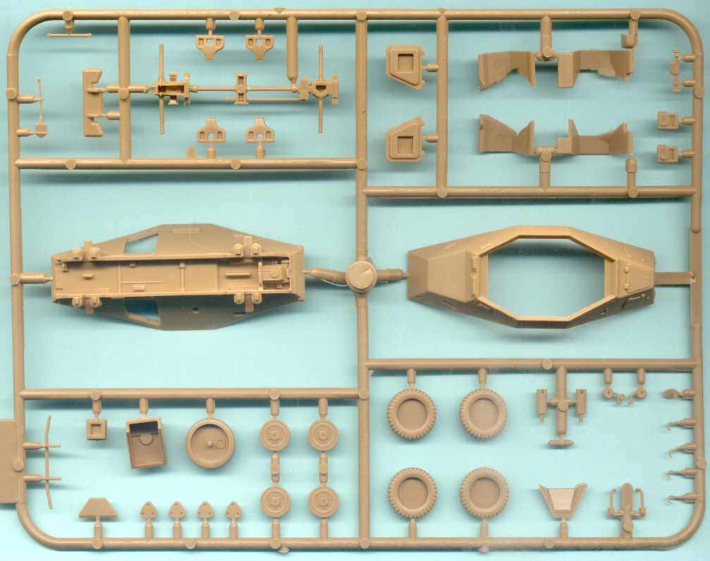 3. Quality: As this kit is based on the Sd.Kfz.222 from ICM, I refer to the review of that kit. Again, there is no interior provided, and given the scarce resources on this vehicle, you're basically on your own. The photo-etch part, on the other hand, is finely done, but the three-part assembly fits difficultly. The main difference with the 222 is the lack of turret, the new hull top and a nice rod antenna. I originally