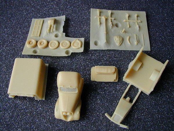 The resin parts are cast with the pour-method of casting, which produces a lot of flash, which will require a lot of care removing it. The parts are of medium quality, including some very delicate and thin, particularly the front grille. This model will improve if some sort of replacement could be found. There are a small number of bubbles in some of the parts, all of which will be easily filled. The main problem is the noticeable warping in some of the parts, which need the care of a hot air source.