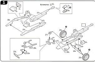 Step 1 is to build the trail, spade, barrel and add the wheels.