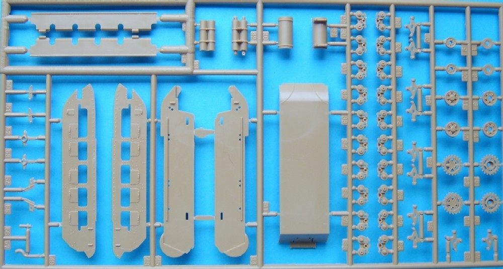 The second sprue contains the lower hull and the running gear along with the exhaust and auxiliary fuel tank. The suspension looks complicated but actually fits together quite easily and is very nicely detailed, shame that most of it is hidden behind the mud chutes and the side skirts.