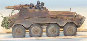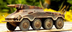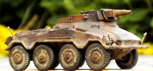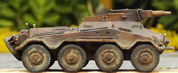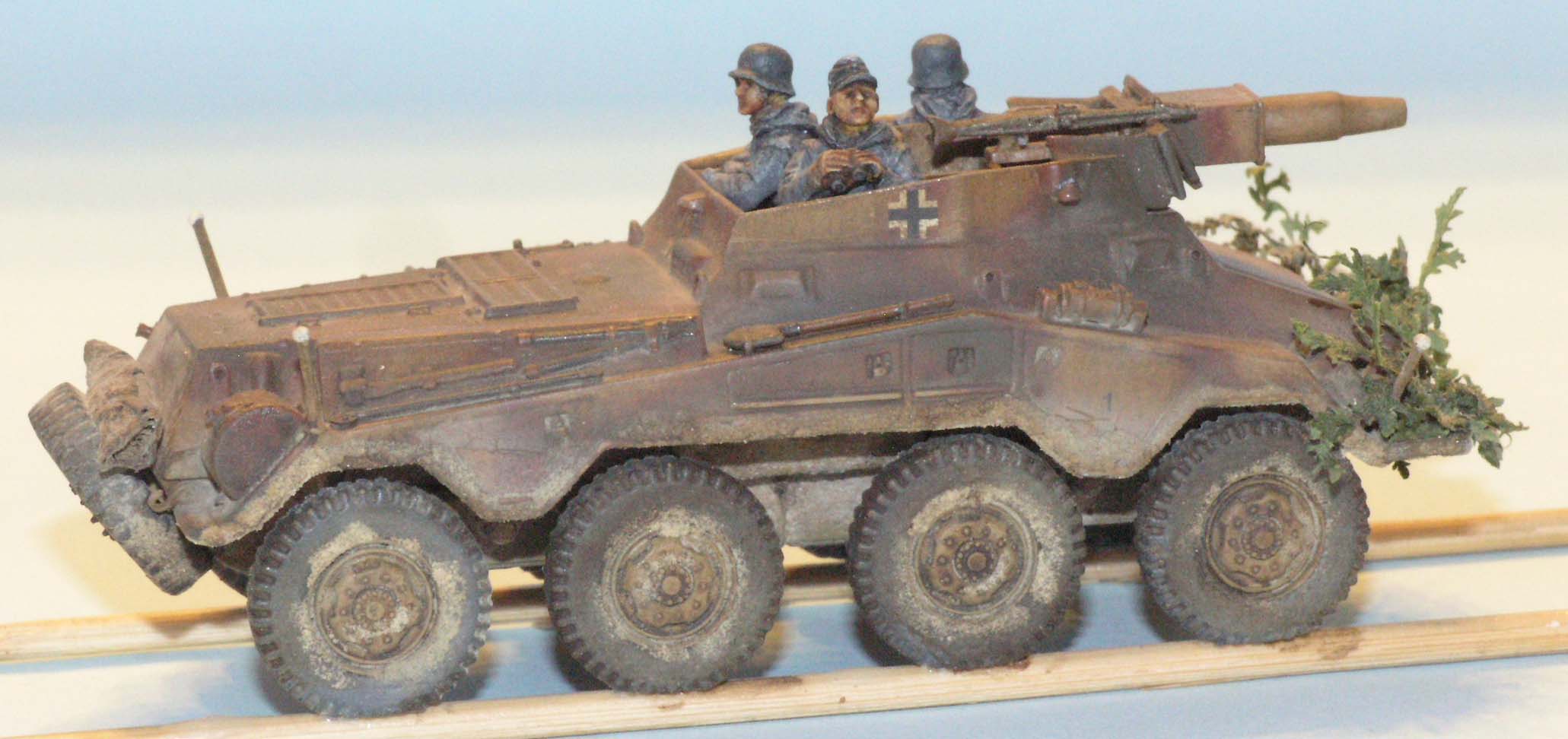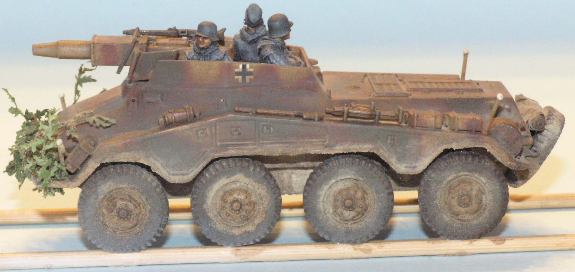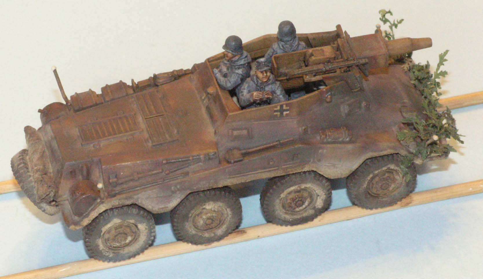 4. Conclusion This is the Sd.Kfz.234 equivalent of a low-cost airline. I bought mine for 5 Euro, which is half the price of the Hasegawa kit (2006 prices), so I am not complaining that some detail is missing, or that some parts are a bit over-scale. It builds very easily and therefore makes for the ideal entry-level AFV. I tried 'speed-building' on it, together with my new airbrush/compressor, a new brand of acrylic paint and some new techniques. I learned a lot from it (for instance, that I should try one new thing at a time), and while I do not have a competition model on the shelf, I am quite happy with it. After all, now that I grow my own Seafoam, I was going to add so much foliage that it would be a riding bush, so the lost detail does not matter too much. In the meantime the Sd.Kfz.234s from Hasegawa and MarS have joined my workbench, and these will benefit from the time and research I spent on this kit. 5. References: [1] Die Gepanzerte Radfahrzeuge des Deutschen Heeres 1909-1945, W.J. Spielberger. Band 4 der Reihe "Militärgahrzeuge" , Motorbuch Verlag [2] Panzer Tracts No. 13 - Panzerspähwagen, by Jentz and Doyle [3] Sd.Kfz.234, Kagero Photosniper 20