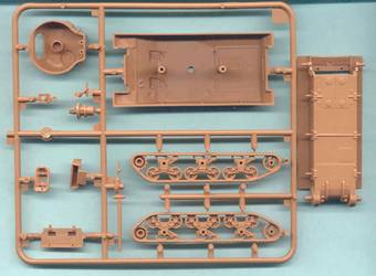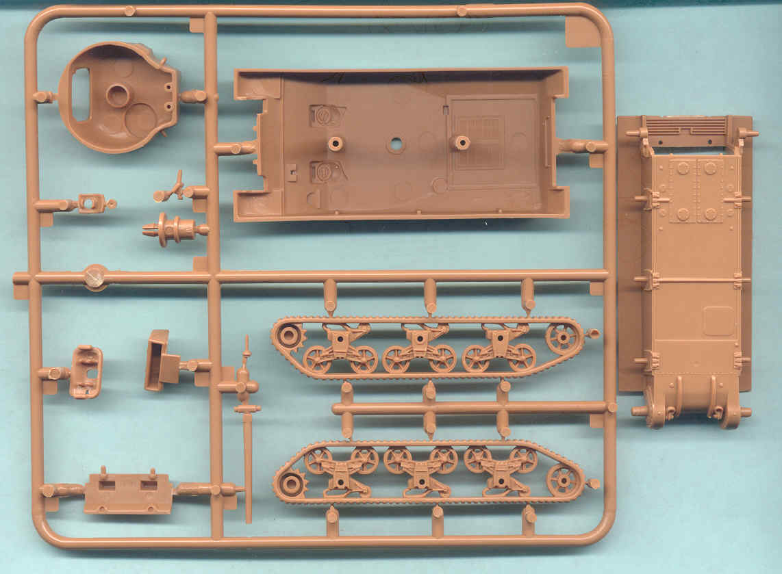 At top is the upper hull with molded on tools and an accurate engine deck for a diesel engine M4A2. At the bow are the two cast steel driver hoods with the small hatches and ventilation domes on either side. At the nose is depicted a three-piece bolted differential cover but lacking bolt detail due to the molding and assembly simplification. The side skirts are molded onto the upper hull. At upper right is the low bustle turret; along with on the hull, all crew hatches are molded shut. The rotor shield (gun mantlet) is the narrow M34 style. At lower right is the lower rear plate with a reasonably accurate pair of muffler and exhaust pipes for the diesel engines. At lower right is the optional storage box for the turret rear; this box is a British addition also used on M4s they supplied to Polish armored forces. At lower left are the two sets of one-piece