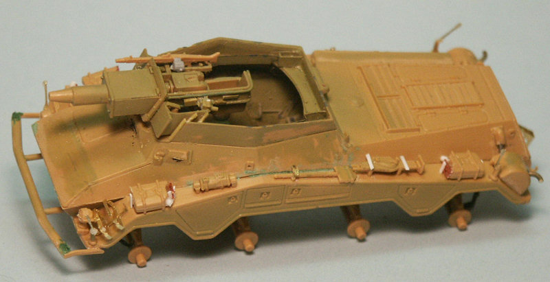 I have long thought that we can learn much about a model kit from the box art. Here we have Italeris nice box art of their 1/72 scale support armored car, often times known as the Stummel due to the short 75-mm gun, the same main weapon as mounted in the SdKfz 251/9 and SdKfz 250/8 halftracks. Italeris depiction shows a vehicle finished in overall dark yellow (Dunkelgelb RAL 7028) color. We see a light sheen to the rubber tires contrasting with the more flat vehicle paint. The paint finish appears streaked with dust running down the sides. In addition to the exterior stowage we can see inside through the open exterior the main gun breach and what appears to be an ammunition storage box. On the back of the box Italeri gives us three 3-view color paintings for Heer (German Army) vehicles in France, the color guide is nice but the choice in markings are disappointing to me and other modelers who focus on the Eastern Front. Italeris decals cover the three vehicles in the color guide. This is a comparison of Italeris SdKfz 234 upper hull (in tan styrene @ far right) with the Hasegawas gray styrene hull in the center and Rodens light gray upper hull at far left. Rodens hull is a tad longer and all the hulls appear slightly different in rendition of some fittings and parts such as the engine deck louvers. Italeri gives us exhaust pipes molded on which, for a good display model, would be good to replace with heavy gage wire. All three kits will benefit from etched brass detail and replacement parts. Italeris tan styrene fender at top is similar in quality and proportions to Hasegawas fender immediately below it. Rodens fenders at the very bottom are slightly longer than the others. Roden gives us a wonderful option of having open storage bins. Like their other parts Italeri molds their fender parts very well with few to no flash or sinkholes throughout the kit. Like other parts Italeris and Hasegawas parts have overall better rendered detail than Rodens. From left to right here we have a side-by-side comparison of Hasegawas SdKfz 234 roadwheels with separate hubs, then Italeris in tan, Rodens two-part black styrene roadwheels, and Attacks resin Puma Wheel Set for the Hasegawa 234 kits. Rodens roadwheels appear slightly smaller than the others. Ive found that Attacks great roadwheels can also be easily modified to use on Rodens SdKfz 234 kit. All the styrene plastic wheels have a problem in missing tread detail on their surface; hence the Attack superbly detailed resin replacement wheels. The backside of Attacks wheels at left show the attachment points where the wheels attach to Hasegawas SdKfz 234 suspension arms. Attacks major drawback is that the way the attachment points are oriented, the flat spot without tire tread where the resin poring stub is will always be visible. Attack should have oriented the wheels so their pour stub spot was on the bottom! With some work these wheels can be modified to fit on the Italeri model. Italeris instructions are pretty clear and simple exploded-view type reflecting the few parts and the simple assembly. Italeri gives us a choice of quick Wargaming assembly with simple rod axles, or display model assembly with the more complicated independent axles and suspension shown in the photo below. Here we have a comparison of the lower hulls and suspension of the Hasegawa SdKfz 234 kit (far left in gray), the Italeri kit in the center, and the Roden kit at far right. I found Italeris suspension to be more complicated to assemble than Hasegawas and had a bothersome gap on the bottom that was filled with green model putty. Italeris wheels attach on posts making it difficult to turn the wheels and to use Attacks aftermarket resin wheels. (BTW, if Rodens suspension looks uneven, that is because the suspension arms were modified so the wheels can be articulated over uneven ground. Since a significant part of the SdKfz 234/3 interior is visible it will need some accurate scratchbuilding as well as a few etched brass parts to get accurate for a display model. At right is how bare the interior would be without many new, additional parts. Some of Italeris interior parts like storage boxes are inaccurate, and things like the fore and aft driver seats are greatly simplefied. A seat back has been taken from a Dragon SdKfz 251 kit; a transmission or drive train piece (the gray box next to the rear divers seat) was cut from a Hasegawa SdKfz 234 kit; the frame for the side escape doors are etched brass; storage boxes and the ammunition ready rack are scratchbuilt. The Italeri rendition of the 7.5-cm K51 gun and upper superstructure is pretty basic and needs some detailing and corrections. The recoil guard received a support frame of copper wire and the front armored plate received some bolts made from copper wire. The interior of the superstructure has a narrow storage bin along its length I fashioned from sheet aluminum. The interior will need to be completed, painted and weathered before the upper and lower hull sections are glued together. Here we see the fore and aft driver locations, ammunition stowage, and underside of the gun mounted on the roof of the upper hull. Good references for the interior of this vehicle were rare for me and my interior is therefore a compilation of details from a half dozen museum shots, historical photos and trusted well-detailed models by respected modelers. The interior was painted all dark yellow, parts like the batteries and ammunition were painted appropriate colors, then a point-wash was applied and all was weathered. Now ready for painting many of the modifications and scratchbuilt pieces can be seen. The attachment points for the wheels are visible. Ta Daaa: the completed model! Colors chosen were a basic three-color sprayed on scheme, though rather than the typical German Rotbraun I opted for a darker brown. Over the Dunkelgelb color a point wash of dark brown and black was applied in recesses and around bolts. The markings are Italeris 