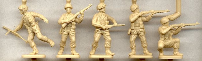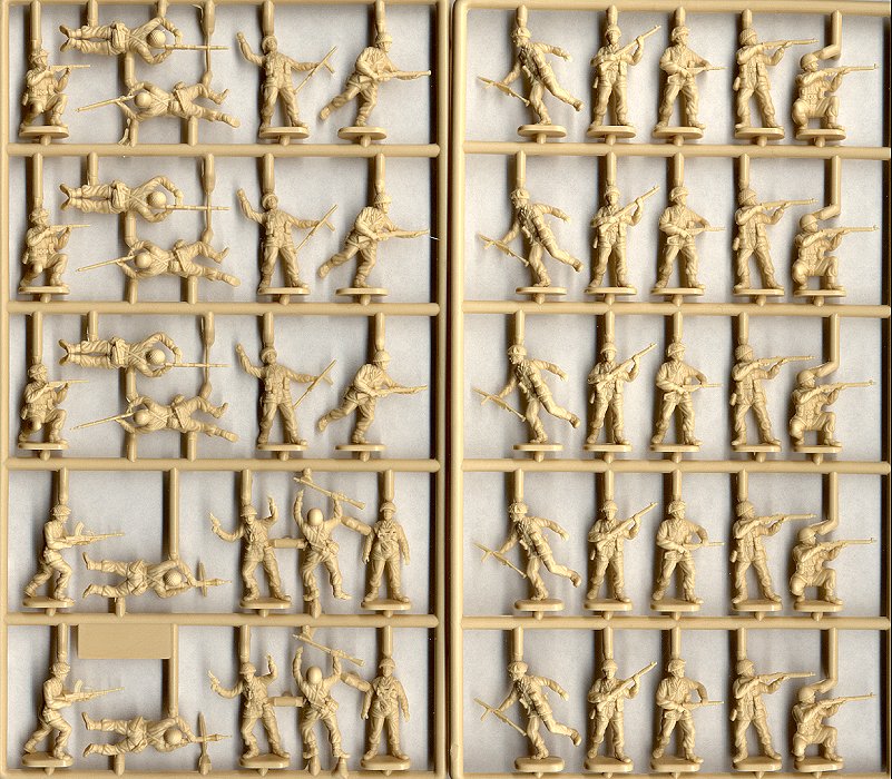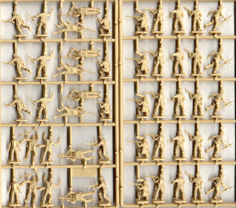 These are essentially the same figures as were originally released by ESCI, but with a couple of improvements. First, the molds have been cleaned up considerably, so the molding quality is much improved, with no flash, and very minor molding seams along the edges of the figures. Second, the plastic that Italeri is using is much more firm than the really soft, flexible, vinyl-like plastic ESCI used. The new stuff is not quite as hard as the styrene used for the AFV kits, but its increased rigidity makes it easier to cut and trim the figures. I have not yet tried gluing any parts, so I don't yet know if this stuff glues any easier.
