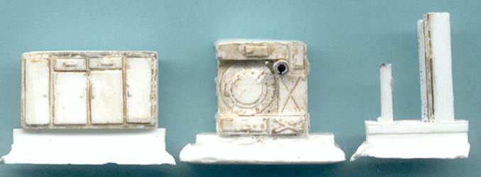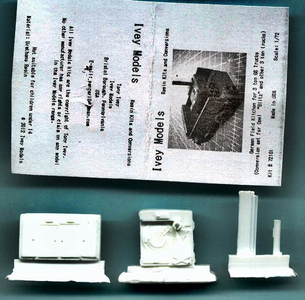 This kit appears to be the first in a line of small scale kits by modeler Tony Ivey; it is a conversion kit to modify a standard 3-ton German military truck of WW2 into a motorized field kitchen (commonly referred to as a Gulaschkanone (Goulash Cannon)) and looks essentially a modification of the horse drawn field kitchen (a vehicle offered in small scale resin media by LEVA Productions and several other manufacturers). I understand that this conversion can be used with the Opel Blitz truck (ESCI, Italeri, Academy and MW kits), Mercedes Benz 3000 trucks (Pegasus Models and resin kit makers), MAN 3000 and Magirus 3000 trucks. The kitchen burned coal or wood. This conversion kit comes in a small ziplock sealed bag and with a cardboard stiffener. Above