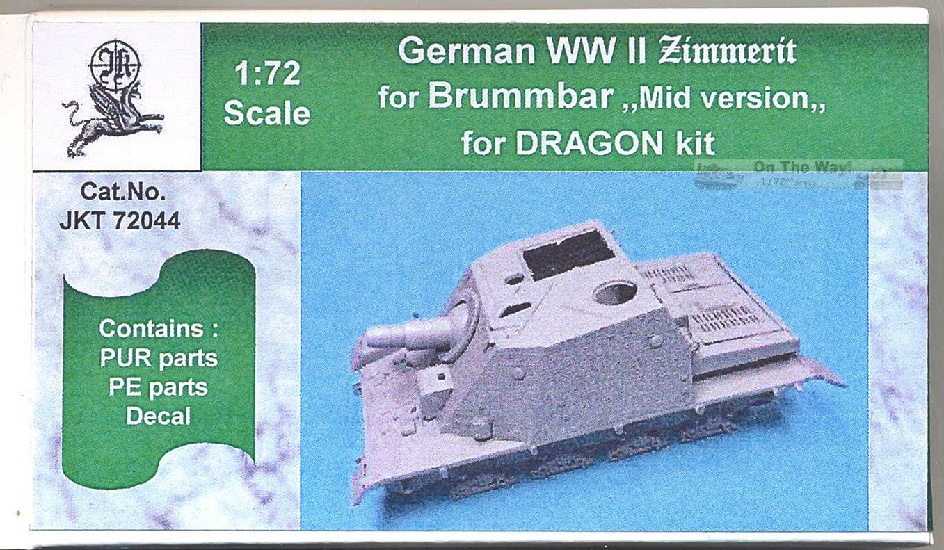 Dragon's "Mid version" (7242) represents a vehicle from the third series, where the best identifying features are the original superstructure, and (compared to the first and second series) the large collar for the gun and lack of driver's visor. All of these were produced in the period where Zimmerit was mandatory. Unfortunately, except perhaps for JK Resin, the Dragon kit does not come with Zimmerit, even though the boxtop shows it and Dragon is entirely capable of replicating Zimmerit.