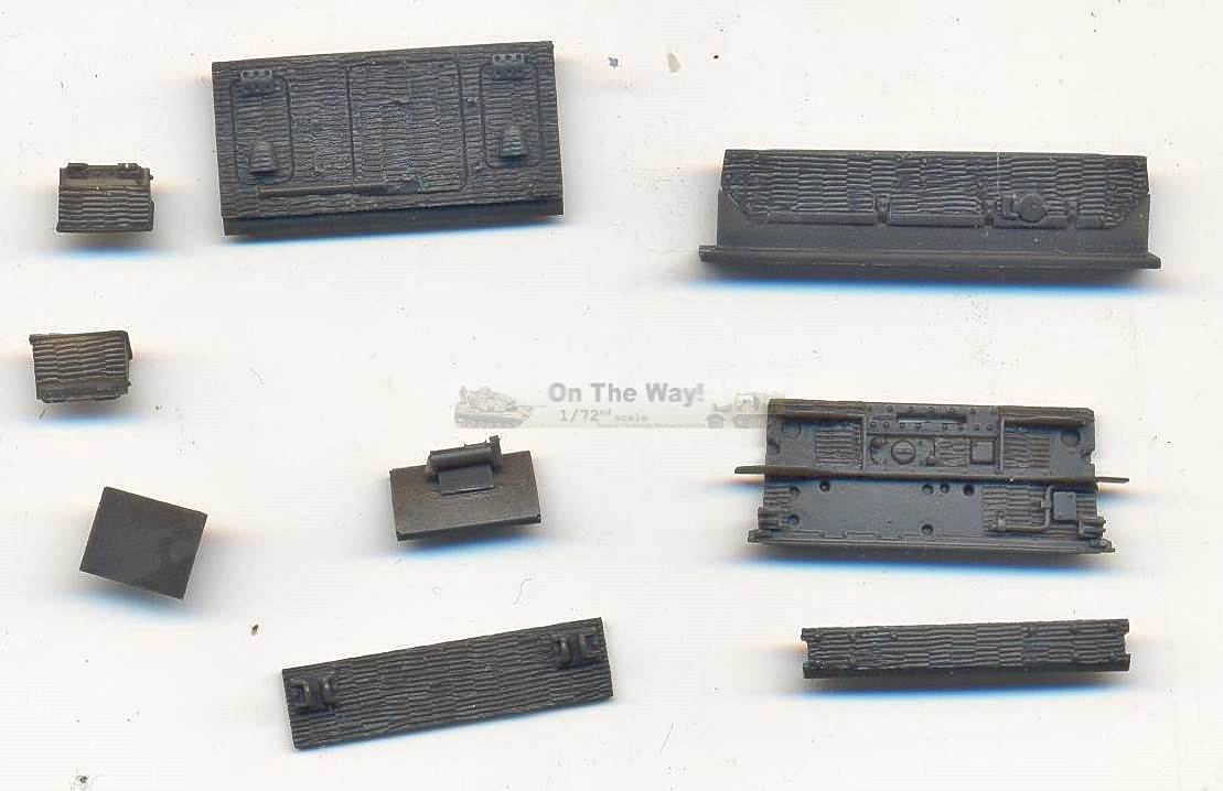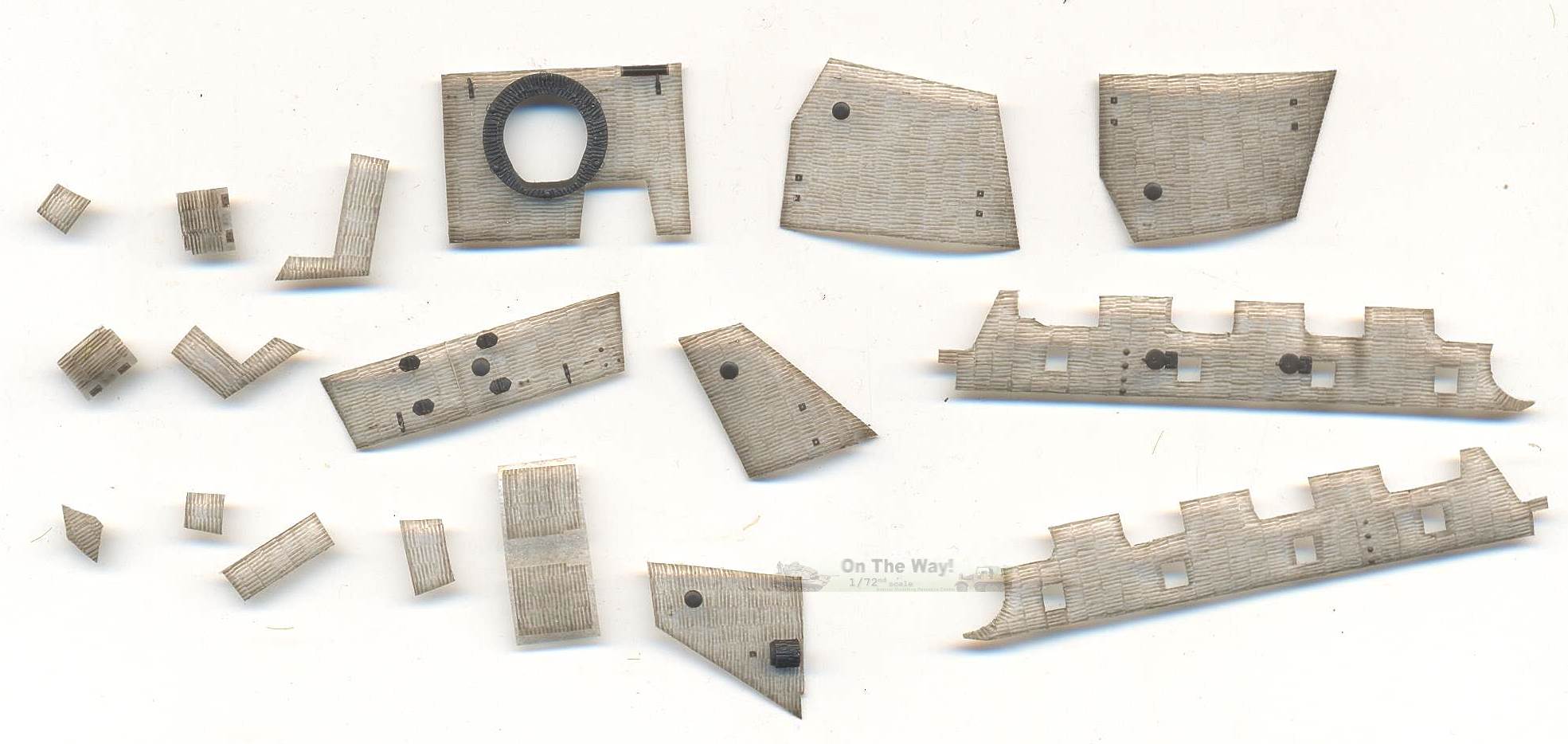 touch. (Don't handle them when you have a cold.) I dry fitted a few of the parts and the fit is excellent. The cutouts (for the gun mantlet, return rollers, etc.) are exactly where they should be and the dimensions are spot on. Note that these resin parts contain some of the small protrusions (like pistol ports, fuel filler lids, ...) that the Dragon parts also have, which mean they have to be removed from the plastic Dragon parts before installing the resin Zimmerit (something the instructions don't point out). Below are the replacement parts. Again, I dry fitted a few parts (stern plate, glacis) and the fit is again at least as good as for the original parts while detail is as crisp as one could hope for. Note that the parts above also contain a fire extinguisher that JK released as a set and comes with a PE part and decals, which is something that raises the detail of the kit to a new level.