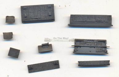 As the instructions already show, the JK Resin set contains a large number of parts, some in wafer thin resin sheets (to the point of being translucent), comparable to JK's general Zimmerit sheets, and more traditional resin replacement parts. Below
