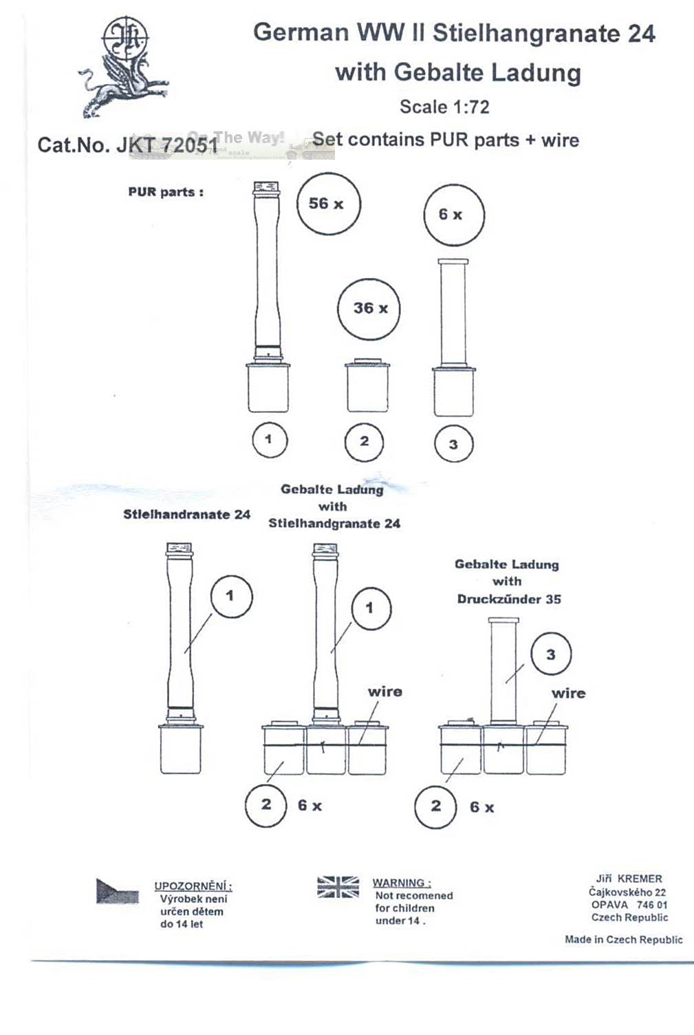 the WWI model. The parts are very delicately cast with very fine detail. Surprisingly for JK Resin, one grenade shaft was short shot, but apart from that, casting quality is perfect.. The Model 24 Stielhandgranate was stored in specially designed crates during transport, which could carry up to 15 individual grenades [1]. This is the subject of the sister set 72049.