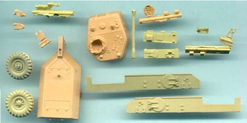 In the above set we have the 75-mm tank gun barrel at upper left next to the combination cast-welded turret. Right of the turret is the new rear plate and driver’s armored plate. Bellow are new left and right side armor plates with round escape hatches that graft onto the plastic kit. Besides the new turret shape, a big change with the Churchill Mark VII is the round side escape hatches and round driver’s view port. The commander’s hatch is molded open with a separate hatch, a nice touch for a half figure. I have no instructions for this conversion kit but fortunately do have the instructions for the Churchill Mk VII Crocodile conversion which covers the Mark VII conversion. For a list of LEVA kits and ordering information see here.