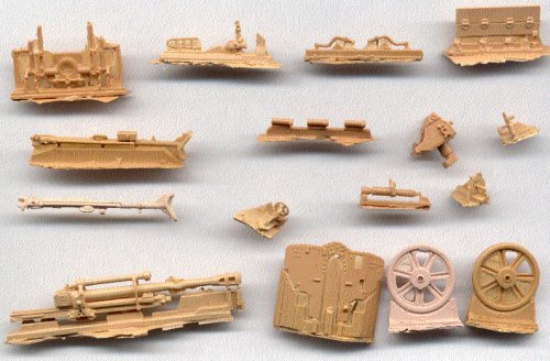 Clean-up was easy with a sharp blade and razor saw. Scoring the pour plugs with a knife or razor saw often allowed the part to be easily snapped off and then cleaned up with a sanding stick and sandpaper. Some parts are very delicate, both of the carriage's torsion bars were broken off during assembly and I recommend that you reinforce them with strips of thin styrene before gluing the wheels on. The muzzle break needs to be drilled out.
