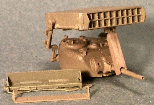 Overall this is a nicely done set, though with a few minor things needing to be tweaked. Firstly, the turrets that mounted this rocket launcher had the early M34 gun mount (with the narrow rotor shield), not the M34A1 as depicted here. Thankfully we have many choices to replace the rotor shield, both after-market or with spare parts from several different plastic kits. The turret included in this kit is an early turret with no loader's hatch, which is likely correct, though the photos I've seen don't show the turret roof to be sure. I would normally mention the commander's hatch being molded closed, but with the rocket launcher mounted on the turret, the hatch pretty much has to be closed, so... no complaints here. The armored covering on the mounting arm that connects to the gun barrel isn't shaped exactly correct, but that is a very easy fix. Note that the piece included in this set depicts the prototype mount (as shown in Hunnicutt's book), but the mounting arm used in the field was attached to the barrel's armored side protectors, rather than to the barrel itself as Stephen has done in these photos. But if you do mount it in the correct position it will also have to be shortened somewhat, as it will stand too high off the turret (the launcher was actually mounted very close to the turret roof, which was the major complaint against this weapon from the troops). And finally, there should be some square armor plates attached to the outsides of the side mounting arms. The mount arms and the box launcher itself are very nicely detailed, and as accurate as I can tell from the available photographs. It would have been nice had the rocket openings on the box launcher's front and rear been molded a little bit deeper, but that probably would have been quite difficult to mold. As I said, I think this is a very nice set. It needs only a couple of minor modifications and additions to make it into a very unique addition to my Sherman collection. Thank you very much to Alain Levesque of Leva Productions for this review sample. |