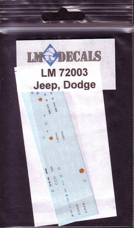 Set contains markings for Willys MB ¼ ton truck, Dodge WC 51/52 ¾ ton truck, Dodge WC 54 ambulance & Dodge WC 62 6x6 truck.