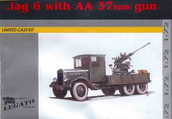 The kit consists model of a 6x4 (six wheels on three axles and four wheel drive out of the six wheels) 1930’s era cargo truck labeled Jag 6, though my references indicate that the 6x4 version of this truck was named the Jag 10. [The actual Jag 6 (or YaG 6) was a 5-ton capacity 4x2 truck under essentially the same truck body & cab.] Based on my two credible references I will refer to this kit herein as a Jag 10. This truck, like its 4x2 cousins, was powered by a Zis 6-cylander engine of 73 bhp. It replaced the similar Jag-4 truck. The Jag was notably larger than the Zis-6 and Gaz-AA trucks. A very interesting variation of the Jag 10 I would love to see mounts a 76-mm AA gun on the bed.