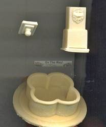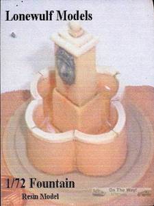 | This three-part set depicts an ornate fountain, typically seen in village squares. Casting is flawless; the only air bubbles that were found are in the pour blocks that need to be sanded down anyway. As a matter of personal taste, I would have liked to have a completely symmetrical fountain, i.e. one with the "head" depicted on all four sides of the central column. This head would, in my opinion, also benefit from a short piece of tubing to represent the orifice where the water comes out. The most