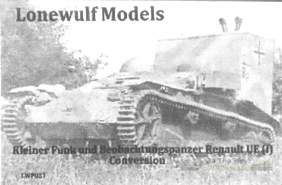 With sets LWP027 and LWP028, Lonewulf gives us an extra reason to buy more S-Model Chenillette UEs. The French version was previewed by Will Alcott, while the Beute-version, with Pak 36, was previewed by myself. Set LWP027 gives us the possibility to build one of the many interesting vehicles concocted by Baukommando Becker, in this case a small observation vehicle. It consists of a box to replace the bin, and which presumably housed a not-too-tall observer, together with new rear mudguards and binoculars. An exhaust with better detail than the kit part is also given. Casting is first rate, with a single airbubble at the end of one of the optical devices. As I was going to replace these extremities with hollow tubing, it's no real loss. Note that you can use either of the S-Model UE kits as they contain all the necessary parts. In case you use 720142 you will be left with a complete Pak 36 that can be put to good use elsewhere. As the instructions only go so far in telling you where to put everything, the following picture taken from the Lonewulf website (now defunct), might be useful.