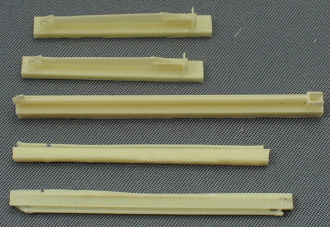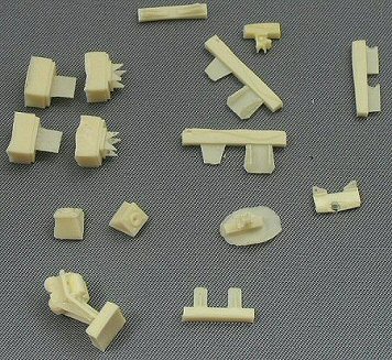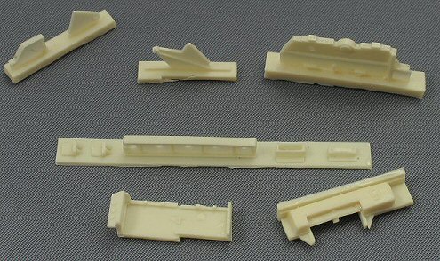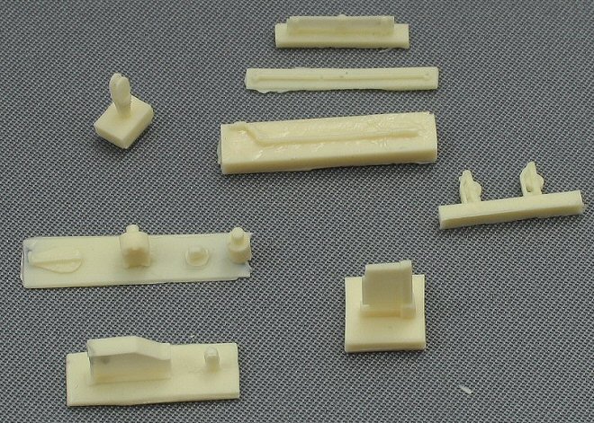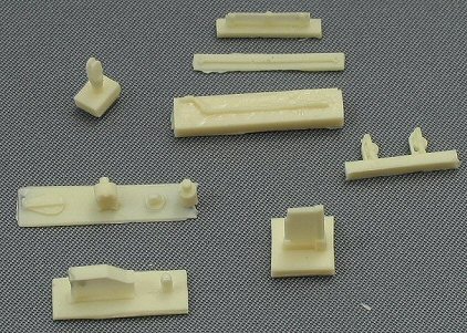 The manufacture also includes several long (and very thin) parts (e.g. for the crane), see picture. I don't consider myself an inexperienced modeller, but I have no clue how those two rods at the bottom of the picture can be cut away from their pouring block without breaking them. Even if you should succeed, how long will they last on the model? To me, including this kind of parts in resin for the sake of being complete seems pretty useless. Why not just provide some brass rod in the correct thickness and only the connection points in resin? |