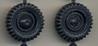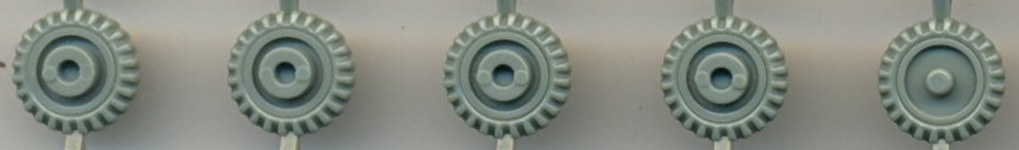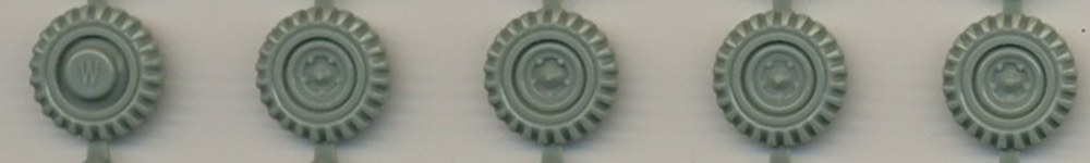 | This set contains five resin wheels. Two are marked "B1", two "B2", and one "BR". The latter clearly is the spare wheel, but it is unclear to me what the difference between "B1" and "B2" is. These wheels represent the most common