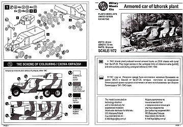 The model includes 47 plastic pieces spread over 3 sprues plus a set of 12 rubber tires. Most of the pieces are cleanly molded, only the turret has some flash. The whole kit is quite rough however: some pieces have heavy detail (raised doors and hinges on the body sides), while some have no detail at all (flat leaf springs). The parts for the armored body are really thick, the radiator armored air intakes are molded solid, gun and MGs are quite chunky and finally the turret, which looks like a copy from UM’s T-26/BA-3, lacks any detail. The rubber tires are the same that can be found on UM’s GAZ trucks. They are quite nice, but the material they are made of can melt the other plastic parts that come in contact with them, so measures must be taken to avoid this. There are no decals included but it seems that the real vehicle didn’t carry any markings. Instruction sheet images courtesy of Henk of Holland. |