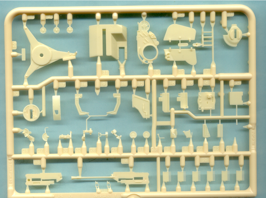 MACO's sprue D here is common to many other MACO kits. I suspect that MACO plans to release a kit of every vehicle that carried the 3.7-cm Flak 43. The parts look very well designed and rendered, and very delicate. The shield parts are very thin. The muzzle of the 3.7-cm gun barrel (part 14) should be drilled out. Six clips of 3.7-cm ammunition (parts 20) are included at lower right.
