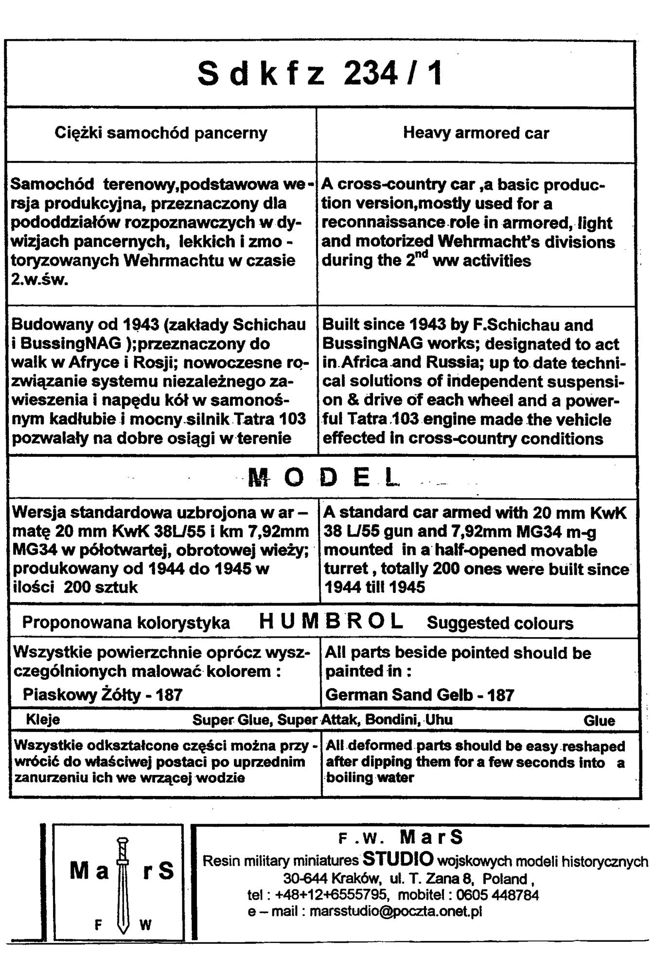be summarized as follows: MarS has released the 234/1 and 234/2, which logically share many components. The hull of the /2 is a solid piece, i.e. without interior, though. The Sd.Kfz.234 underwent some minor changes during the production run: