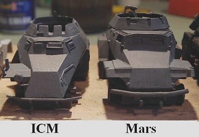 This resin kit has a lot more detail than ICM's to the point that it is somewhat over-engineered (especially the chassis). It is also more expensive, but you get a LOT of parts for your money. The interior is nicely done and well catered for, but still lacks some items, like personal gear (haversacks, gas mask canisters, ), MP40s, pioneer tools. If you really want to add some detail, you could also add the frame to the back of the driver's seat, which should be a bit more reclined as well. The gun mount is correct, and has nice detail, but the spent cartridge bags are missing. A very nice thing about this kit is that it allows you to open most hatches and visors. Pictures on the boxtop show an alternative type of hubcaps (with recesses and without hubcaps protectors), that I associate with LSSAH vehicles in the Balkan campaign [13]. I found the wheels of MarS' Sd.Kfz. 223 in my example (standard type, with integrally molded protectors). Stan (MarS) was so kind to send me a new set. The grating behind the turret is solid, but with texture added. It would be quite difficult to create a see-through effect without major surgery, but it is convincing enough with a suitable wash. The turret mesh frame is of the higher type, and is a weak part of the kit. The frame is quite chunky, and you are supposed to make the mesh itself from a piece of tulle that is included with the kit. I found the latter quite difficult to cut, glue and paint, but managed to a certain degree. You will need to add the support rods if you leave the mesh open. You get footsteps under the rear fender, these were (apparently) only fitted to late war vehicles (judging from the available photographs. The typical small plate on the turret in front of the optics is not provided, but is easy to make from some plasticard. Mars gives you turn indicators with cage and width indicators. The latter are quite thick for this scale. (More about them later.) The worst fit I encountered in this kit were the exhaust, and I ended up making new tubing and carving cut-outs in the rear fenders.