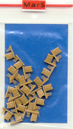 ![]() Not much needs to be said about this set. Approximately 25 cans are included, with separate handles. All parts are crisply molded with no flash or blemishes. Far better than the jerry cans included with most model kits, these are a necessity for diorama builders and super-detailers. |