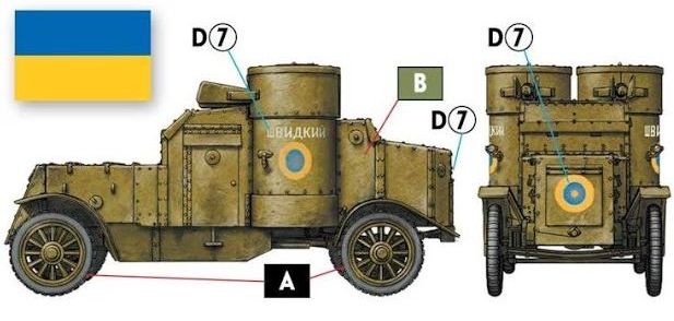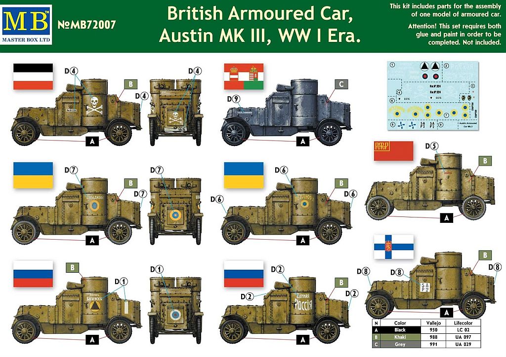 Russian, Ukrainian and Finnish machines. The majority of websites state German Freikorps Austins were grey. I guess the modeller will have to decide for themselves