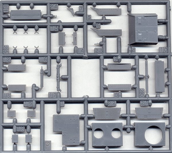 Sprue P (why P?) has the upper hull and most of the detail parts. As you can see, there are some parts unique to each version here, plus some optional parts. The 7TP (single turret) kit allows you to build early or late versions of the tank, with differing exhaust parts. All vertical plates are molded flat to allow for good bolt detail. Panel lines are recessed, and hatch handles are molded as separate parts, but they may be a little heavy, and should probably be replaced with bent wire. Storage boxes have separate lids so can be modeled open. Front driver's hatch is also molded open. Engine access hatches are molded shut, but with the flat parts layout, it should be easy to open them up if you wish to add an engine (not included).