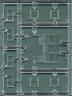 The following sprues show the new parts for this kit: The interior is completely detailed, and the modeler has the choice of showing it off with open sides, or closing it with canvas siding. Many of the clear parts directly replace some of the gray styrene parts - window, frame and all - requiring us to mask off the window for painting. This will give a much more realistic appearance than inserting an overly-thick clear part into an open window, as in most kits.