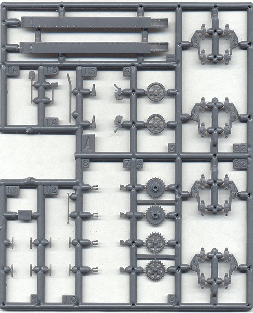 Sprue A contains the sprocket wheels, fenders, pioneer tools, wheel supsension units, and miscellaneous details. The sprocket wheels are amazingly detailed with superb bolt detail, and very fine, and in-scale sprocket teeth. The detail on everything is fantastic. Bolts are numerous, and everything is very well molded. There are some sink marks on the wheel suspensions, but they are easily accessible for fixing with putty.