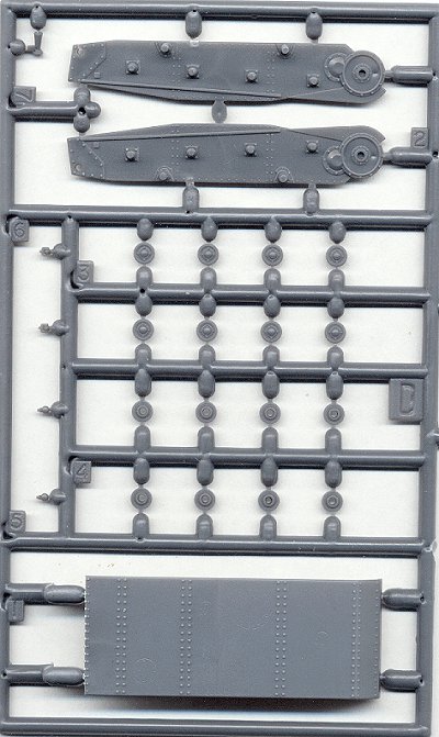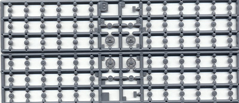 This scan shows two wheel sprues, front and back, but only one comes with each kit. Like the sprockets, the idler wheels are very detailed.