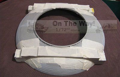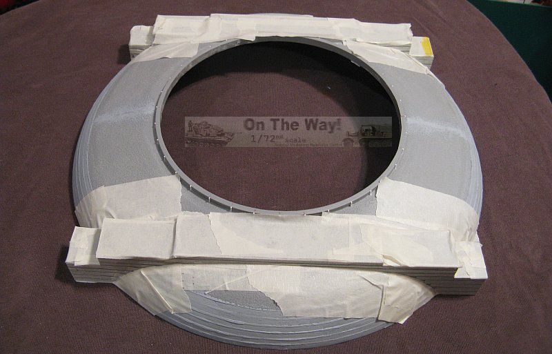 of the same diameter as the turret ring, and marked the intervals, using the base's join line as center. After taping the cardboard to the ring, each stiffner
