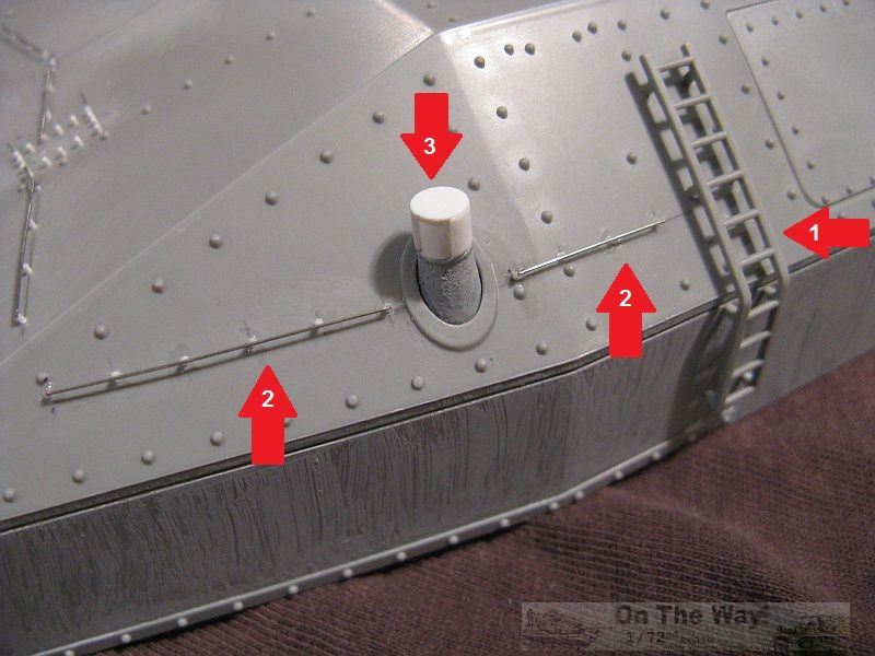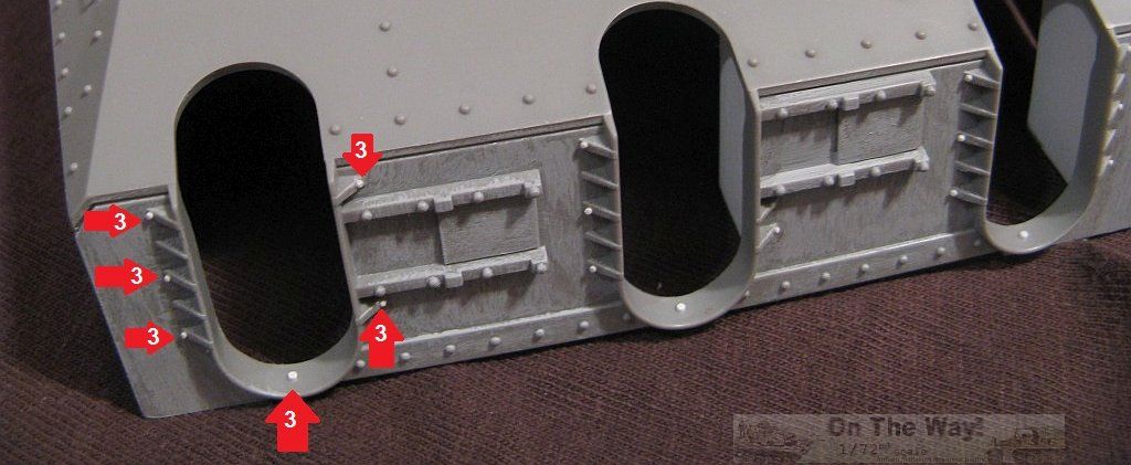 - Add more rivets to bottom of gun openings and their side braces. (red arrows w. white 3)