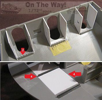 under construction on the cruiser from ref. [2] shows them even better (yellow arrows w. black 1 - middle photo). So walls were constructed from plastic sheet. A