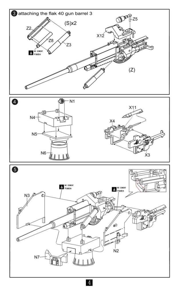 kit. One Flak 40 has been preserved in the Wehrtechnischen Studiensammlung Koblenz. This makes it possible to check the accuracy of the kit. To be honest, Modelcollect has done the job very well. The complex aiming and fire control system are replicated in great detail, with all buttons, shafts and rivets where they should be. In recent years, the new company Modelcollect has built a reputation of extremely well detailed kits and this gun is no exception to the rule. For modellers who like to participate in modelling contests: this is the type of kit you can turn into a winning model. For those who like to make dioramas: a number of spare shells are also included. The crucial part of the kit is the impressive gun barrel. Unlike some other kits in the Modelcollect range, you do not get a metal barrel. You will have to glue two halves together, with the inevitable task to make the joint invisible. Luckily, the parts fit well and give only a small joint. By successively sanding with 2000, 4000 and 6000 sanding paper, I was able to remove the joint quite easily. The same has to be done with the gun’s breach block (somewhat more difficult) and elevation mechanism. Often, also ejection marks are a delicate point. As Modelcollect is a modern company, they have taken this into account when designing the kit. All ejection marks are situated on places where they will not be visible when your kit is finished. The one exception are the ejection marks on the inside of the side supports of the gun. As the inside of these supports is completely flat, it should not be a problem to hide them with the magic duo ‘filler + sanding paper’. Some critical remarks remain for the building instructions. Some steps in the building process require a close look as the instructions are not always that clear. A pity is also the lack of detail in the painting scheme. Modelcollect suggest two options: German grey or German dark yellow. The example at the Wehrtechnischen Studiensammlung Koblenz however suggests much more detail (e.g. control wheels and instrument panels in black, several buttons and handles in red). No painting details are revealed for the shells either. These have almost the size of a man, so they are large enough to be painted with a lot of detail. Conclusion: A highly