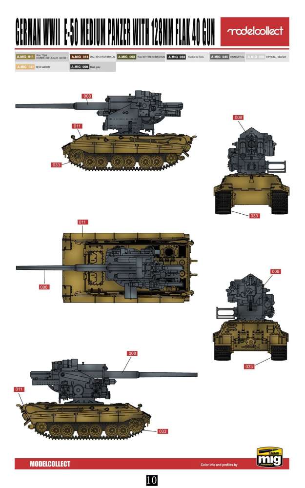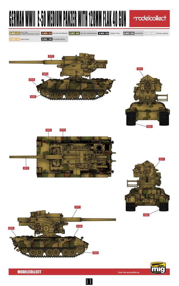 Some history It is not a shame if you have never heard of the German E-50 tank with the tower replaced by an 128 mm Flak 40. This armoured fighting vehicle is a mere creation of the Chinese modelling company Modelcollect. It is not a historical vehicle, but a so called ‘paper panzer’. The only historical part of the ‘paper panzer’ is the 128 mm Flak 40. The gun was without any doubt one of the best German anti-aircraft guns in WWII. This heavy gun could fire a shell of 26 kg as high as 35.000 feet, where it would burst apart in a deadly cloud of shrapnel. Some sources even state an altitude of 48.500 feet. This was high enough to take even the highest flying allied bombers out of the sky. Production of the Flak 40 started in 1942. By the end of the war 1.125 of these heavy anti-aircraft guns had been produced, of which 34 were double guns for use on specially designed Flaktowers. The Germans also made some attempts to give the 128 mm Flak 40 some mobility. As the power of the Luftwaffe was declining, the need grew for more powerful anti-aircraft guns to protect the Reich against the growing intensity of the allied bombings. In this way the Germans produced a specially designed trailer, but as trailer and gun weighed over 26 tons, this was not a success. In this way, it could have been an idea to put the gun on top of a E-50 hull. The German E-series was an attempt to rationalize tank production. The Germans had so many different types of tanks that logistics and maintenance were a nightmare. Besides, all these tanks and AFV’s were produced in rather small numbers. Under supervision of the Minister of War Production Albert Speer, the Germans took up the plan to simplify all this. The aim was to concentrate on six types of tanks, which would be produced in larger quantities. Each type would use as much of the same parts as the other types, thus simplifying logistics and maintenance. The new tanks would be classified as the E-range, the ‘E’ meaning ‘Einheit’ or ‘Standard’. According to their weight, the E-tanks would be: E-5, E-10, E-25, E-50, E-75 and E-100. The E-50 would have been the successor of the Panther tank. However, the war ended before any of these tanks were produced.