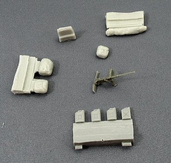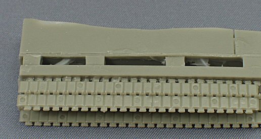 The Hull The hull is one massive part with acceptable detail. However, due to the bad quality of the casting, it is useless. Although being a massive block of resin, the engine deck looks like it has collapsed under a heavy weight, something I have never encountered before. I have no clue what could have caused this? Maybe a bad mould? Apparently the model on the box art also has this problem. Check this picture on the Model-Miniature flickr page. Anyway, this is a serious problem that is impossible to correct without major surgery. Noticy also the resin flaking on the mudguards. |