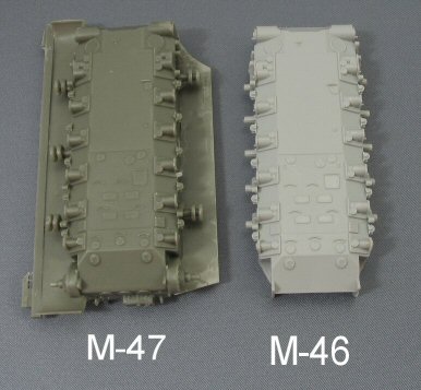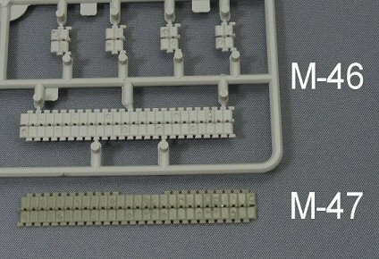 The tracks On inspection of the tracks, I discovered a regular pattern of ejection marks. On a resin kit??? This bewildered me at first until I got myself the M46 Trumpeter kit # 7288 (which contains link & length plastic tracks). I compared the Model-Miniature tracks with the Trumpeter ones and found both sets have their ejection marks placed in a similar pattern. I therefore can only conclude that the M47 resin tracks runs are a slightly adapted copy of the Trumpeter ones, made longer by gluing some links to them. However these M46 tracks are the T80 steel type, which were only used on the earlier M47 tanks. The type most commonly used with the M47 is the T84E1 with the rubber chevron. |
