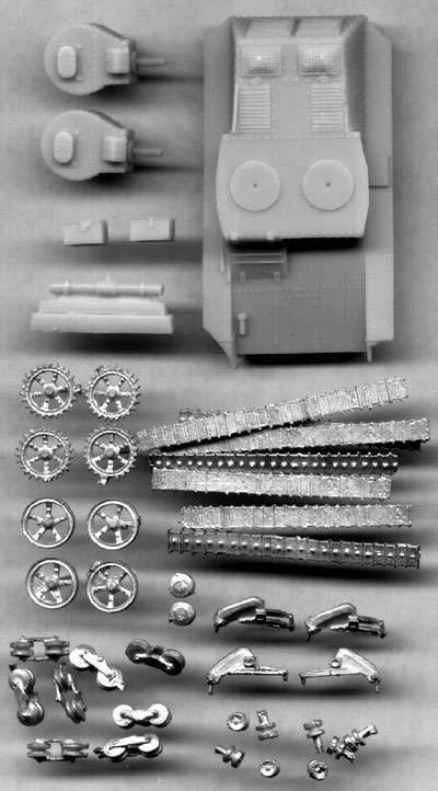 Another remarkably well detailed kit from Modelkrak. It is a simple kit, with only six resin and 38 metal parts. The hull, turrets, muffler and storage boxes are resin, and the wheels and tracks are metal. The level of detail is very good, with excellent representations of rivets, engine deck screens, and the MG's in the turrets. The quality of resin is superb, with very crisp moldings, and no airbubbles. Large pour blocks need to be removed from the bottoms of the turrets and hull. All of the fender corners on my kit were broken during shipping, but thanks to packing the kit in a zip-lock bag, all the parts are present and can be easily fixed.