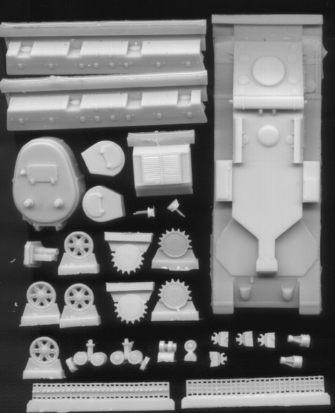 Again, the detail on this kit is magnificent. Modelkrak is easily one of the best manufacturers of resin kits available. In the scan above, only a small number of the bogie wheels and track segments are shown. The sprocket wheels are missing teeth where the track wraps around the front of the wheels, and although most model builders will likely have cut off the teeth themselves, if anyone wanted to build a diorama with the track off the wheels, they will now have to add some teeth, which should be fairly simple to do. There are no markings included, and no description of the neat paint scheme depicted on the box cover (from the Winter War with Finland?).