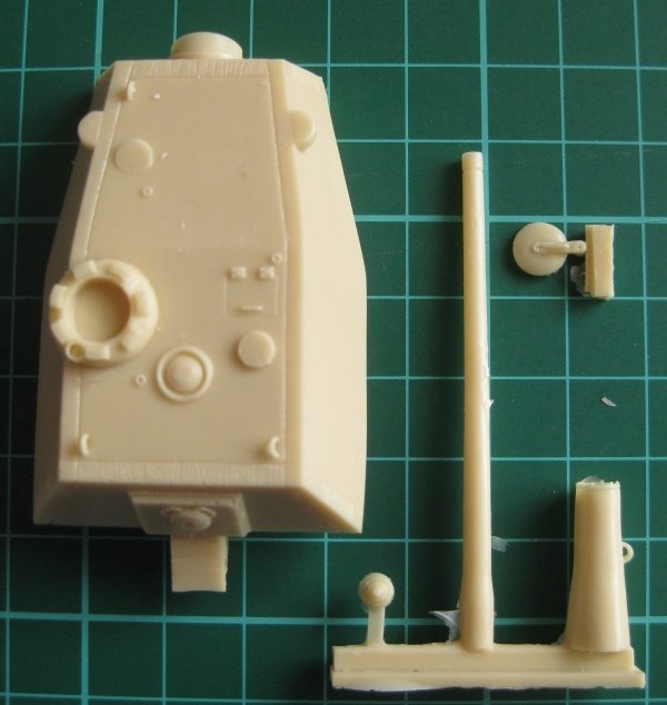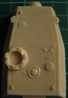 This conversion of the Dragon Armor E-100 super heavy tank (kit no. 7256) converts the tank from the Krupp turret of the Ausf. A (fielding a 150mm gun) into an Ausf. B with an alternative turret shape and sporting the 12.8cm PaK 44 L/55 used on the Jagdtiger. Since neither version was ever finished this kit belongs firmly in the Panzerwaffe '46 section of any German amour modellers collection. The Modeltrans offering comes in a simple plastic bag with card backing that doesn't help in keeping the contents safe and secure and it's worth transferring it to a more robust container if storage for a prolonged period is envisaged. Sad to say one of the four lifting lugs on the turret roof was missing on my copy due to this. The kit is a very straightforward affair consisting of the turret and two sprues, one containing the barrel, cradle extension and gunner's sight head (??) and the other containing the commander's cupola hatch. Since I have no references the item I believe to be a sight head may not indeed be such though it is clear where it mounts, in front of the commander's cupola where on the E-100 Ausf. A turret a sight does exist. The kit parts are generally moulded well with crisp detail, a small amount of flash and only a few air bubble holes, most evident on the turret rear, which will need filling. The turret base contains a significant moulding plug but should prove no problem to remove.